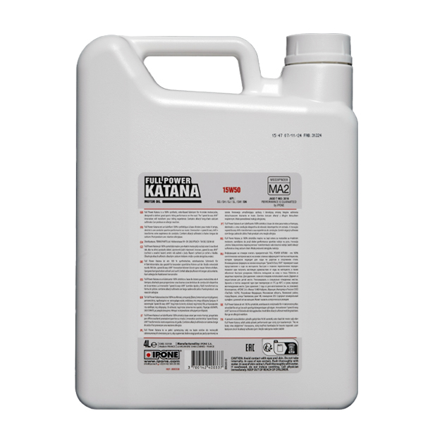 IPONE Full Power Katana 15W50 — это высокоэффективное полностью синтетическое моторное масло, созданное для мотоциклов, где вязкость 15W50 является оптимальной. Особенно хорошо оно подходит для чопперов, круизеров, кастомов и байков в стиле боббер, включая модели Harley-Davidson, Yamaha, Honda и другие.