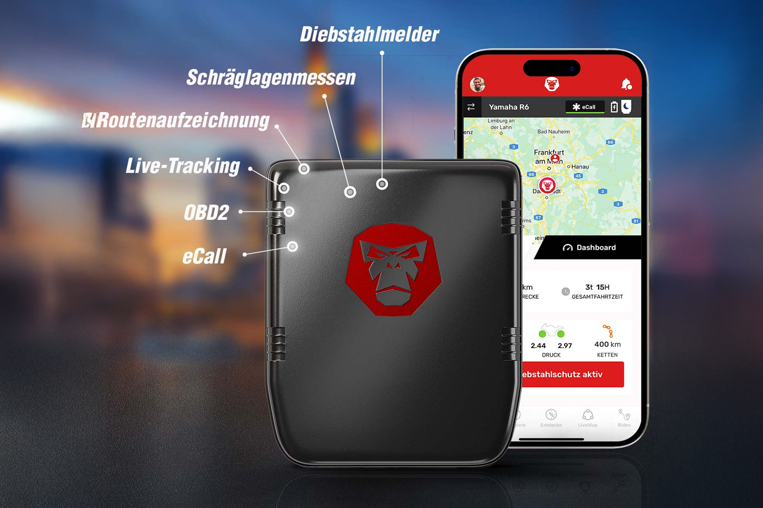 - Захист від крадіжки: Високочутливі датчики виявлять будь-який рух мотоцикла. Ви отримаєте повідомлення на смартфон, якщо пристрій зафіксує рух. Час роботи пристрою на внутрішньому акумуляторі – до 4 годин відстеження або до 4 днів у режимі очікування.
