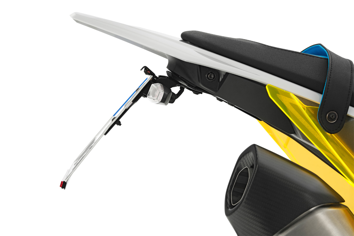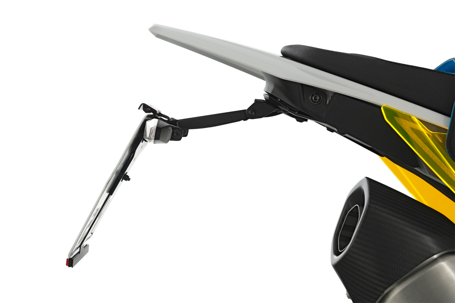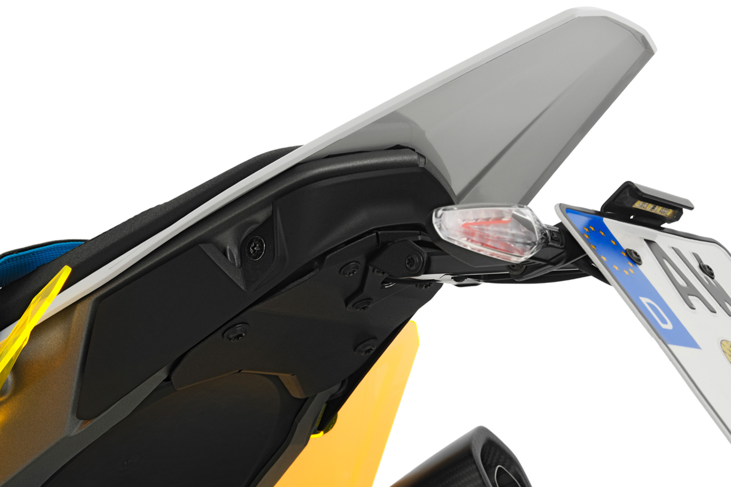До комплекту входить точно підігнаний нижній обтічник, який слугує основою для кріплення тримача номерного знака та акуратно закриває зазор, що утворюється після демонтажу штатного елемента. Кут нахилу та висота номерного знака регулюються, а сам номер можна встановити у двох варіантах: з кронштейном або без нього — наприклад, для більш спортивного використання.