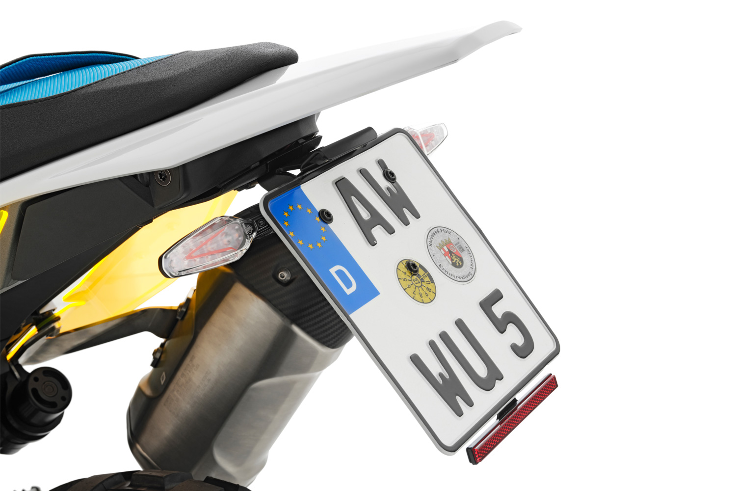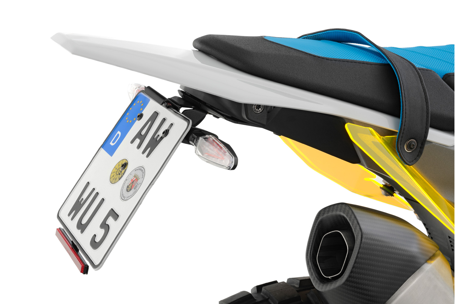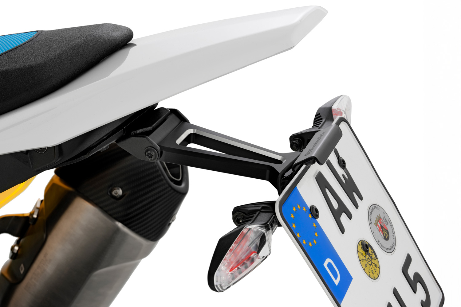 Тримач підготовлений для повторного використання оригінальних комбінованих покажчиків повороту 3-в-1 (поворотник / габарит / стоп-сигнал), оснащений знімним відбивачем і світлодіодним підсвічуванням номерного знака з E-маркуванням. Усі електричні з’єднання та кабелі прокладаються приховано, що забезпечує охайний зовнішній вигляд. Установка проста і не потребує отримання ABE.
